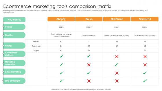 Following slide provides information about ecommerce marketing software solution. It includes key metrics such as pricing, best for business, rating, ecommerce platform, marketing automation, email marketing, and drip campaigns.Presenting this PowerPoint presentation, titled Ecommerce Marketing Tools Comparison Matrix Comprehensive Guide For Marketing Technology, with topics curated by our researchers after extensive research. This editable presentation is available for immediate download and provides attractive features when used. Download now and captivate your audience. Presenting this Ecommerce Marketing Tools Comparison Matrix Comprehensive Guide For Marketing Technology. Our researchers have carefully researched and created these slides with all aspects taken into consideration. This is a completely customizable Ecommerce Marketing Tools Comparison Matrix Comprehensive Guide For Marketing Technology that is available for immediate downloading. Download now and make an impact on your audience. Highlight the attractive features available with our PPTs. Following slide provides information about ecommerce marketing software solution. It includes key metrics such as pricing, best for business, rating, ecommerce platform, marketing automation, email marketing, and drip campaigns.