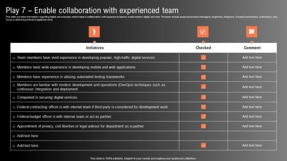 This slide provides information regarding digital services play which helps in collaboration with experience team to create modern digital services. The team include seasoned product managers, engineers, designers, 3rd party technicians, contractors, who focus on delivering effective digital services. Make sure to capture your audiences attention in your business displays with our gratis customizable Play 7 Enable Collaboration With Experienced Team Technological Innovation Playbook Download Pdf. These are great for business strategies, office conferences, capital raising or task suggestions. If you desire to acquire more customers for your tech business and ensure they stay satisfied, create your own sales presentation with these plain slides. This slide provides information regarding digital services play which helps in collaboration with experience team to create modern digital services. The team include seasoned product managers, engineers, designers, 3rd party technicians, contractors, who focus on delivering effective digital services.