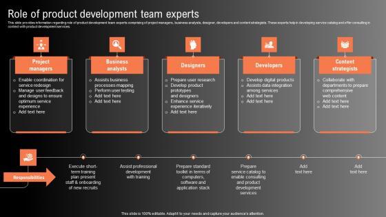 This slide provides information regarding role of product development team experts comprising of project managers, business analysts, designer, developers and content strategists. These experts help in developing service catalog and offer consulting in context with product development services. Slidegeeks has constructed Role Of Product Development Team Experts Technological Innovation Playbook Sample Pdf after conducting extensive research and examination. These presentation templates are constantly being generated and modified based on user preferences and critiques from editors. Here, you will find the most attractive templates for a range of purposes while taking into account ratings and remarks from users regarding the content. This is an excellent jumping off point to explore our content and will give new users an insight into our top notch PowerPoint Templates. This slide provides information regarding role of product development team experts comprising of project managers, business analysts, designer, developers and content strategists. These experts help in developing service catalog and offer consulting in context with product development services.
