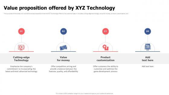The purpose of this slide is to outline the value proposition that the XYZ Technology offers to its customer base. It includes cutting edge technology, value for money, product customization, etc. Welcome to our selection of the Value Proposition Offered By XYZ Technology Video Game Financing Pitch Deck. These are designed to help you showcase your creativity and bring your sphere to life. Planning and Innovation are essential for any business that is just starting out. This collection contains the designs that you need for your everyday presentations. All of our PowerPoints are 100Percent editable, so you can customize them to suit your needs. This multi purpose template can be used in various situations. Grab these presentation templates today. The purpose of this slide is to outline the value proposition that the XYZ Technology offers to its customer base. It includes cutting edge technology, value for money, product customization, etc.