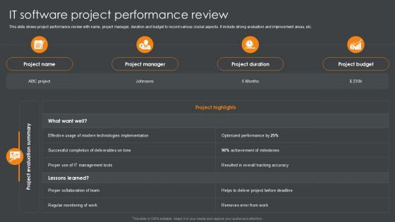 This slide shows project performance review with name, project manager, duration and budget to record various crucial aspects. It include strong evaluation and improvement areas, etc. Want to ace your presentation in front of a live audience Our IT Software Project Performance Review PPT Presentation SS can help you do that by engaging all the users towards you. Slidegeeks experts have put their efforts and expertise into creating these impeccable powerpoint presentations so that you can communicate your ideas clearly. Moreover, all the templates are customizable, and easy-to-edit and downloadable. Use these for both personal and commercial use. This slide shows project performance review with name, project manager, duration and budget to record various crucial aspects. It include strong evaluation and improvement areas, etc.