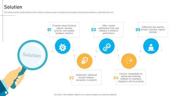 This slide provide the solutions offered by the company to address issues. It includes technical support, advanced security features, optimization tools, etc. If your project calls for a presentation, then Slidegeeks is your go-to partner because we have professionally designed, easy-to-edit templates that are perfect for any presentation. After downloading, you can easily edit Solution IT Infrastructure Service Provider Business Models BMC SS V and make the changes accordingly. You can rearrange slides or fill them with different images. Check out all the handy templates This slide provide the solutions offered by the company to address issues. It includes technical support, advanced security features, optimization tools, etc.