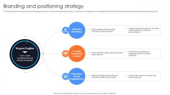 The following slide showcases the branding strategy to position IT startup among the target audience. It showcases strategies such as authentic storytelling, thought leadership content and interactive brand engagement.Boost your pitch with our creative Branding And Positioning Strategy Information Technology Startup Go To Market Strategy GTM SS V. Deliver an awe-inspiring pitch that will mesmerize everyone. Using these presentation templates you will surely catch everyones attention. You can browse the ppts collection on our website. We have researchers who are experts at creating the right content for the templates. So you do not have to invest time in any additional work. Just grab the template now and use them. The following slide showcases the branding strategy to position IT startup among the target audience. It showcases strategies such as authentic storytelling, thought leadership content and interactive brand engagement.