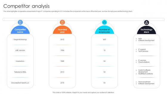 The slide highlights comparative assessment of major IT companies operating in US. It includes the comparison on the basis of founded year, number of employees and technology stack.Want to ace your presentation in front of a live audience Our Competitor Analysis Information Technology Startup Go To Market Strategy GTM SS V can help you do that by engaging all the users towards you. Slidegeeks experts have put their efforts and expertise into creating these impeccable powerpoint presentations so that you can communicate your ideas clearly. Moreover, all the templates are customizable, and easy-to-edit and downloadable. Use these for both personal and commercial use. The slide highlights comparative assessment of major IT companies operating in US. It includes the comparison on the basis of founded year, number of employees and technology stack.