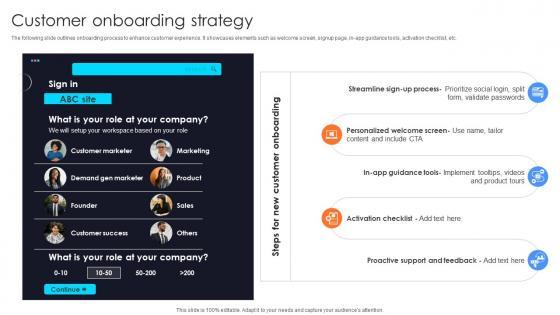 The following slide outlines onboarding process to enhance customer experience. It showcases elements such as welcome screen, signup page, in-app guidance tools, activation checklist, etc.Get a simple yet stunning designed Customer Onboarding Strategy Information Technology Startup Go To Market Strategy GTM SS V. It is the best one to establish the tone in your meetings. It is an excellent way to make your presentations highly effective. So, download this PPT today from Slidegeeks and see the positive impacts. Our easy-to-edit Customer Onboarding Strategy Information Technology Startup Go To Market Strategy GTM SS V can be your go-to option for all upcoming conferences and meetings. So, what are you waiting for Grab this template today. The following slide outlines onboarding process to enhance customer experience. It showcases elements such as welcome screen, signup page, in-app guidance tools, activation checklist, etc.