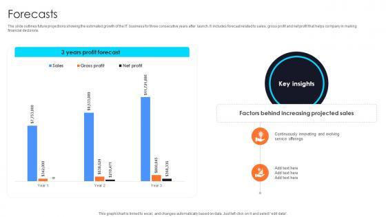 The slide outlines future projections showing the estimated growth of the IT business for three consecutive years after launch. It includes forecast related to sales, gross profit and net profit that helps company in making financial decisions.Slidegeeks is here to make your presentations a breeze with Forecasts Information Technology Startup Go To Market Strategy GTM SS V With our easy-to-use and customizable templates, you can focus on delivering your ideas rather than worrying about formatting. With a variety of designs to choose from, you are sure to find one that suits your needs. And with animations and unique photos, illustrations, and fonts, you can make your presentation pop. So whether you are giving a sales pitch or presenting to the board, make sure to check out Slidegeeks first The slide outlines future projections showing the estimated growth of the IT business for three consecutive years after launch. It includes forecast related to sales, gross profit and net profit that helps company in making financial decisions.