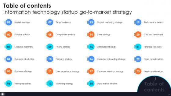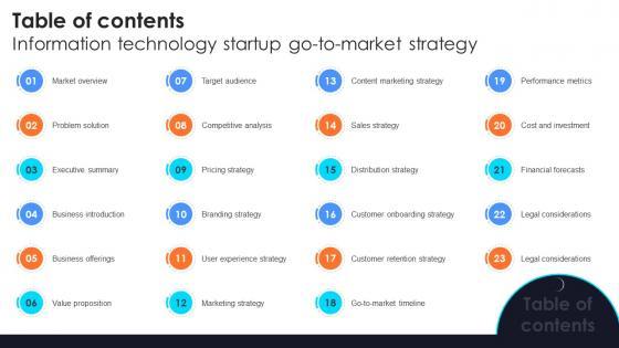 Welcome to our selection of the Table Of Contents Information Technology Startup Go To Market Strategy GTM SS V. These are designed to help you showcase your creativity and bring your sphere to life. Planning and Innovation are essential for any business that is just starting out. This collection contains the designs that you need for your everyday presentations. All of our PowerPoints are 100 percent editable, so you can customize them to suit your needs. This multi-purpose template can be used in various situations. Grab these presentation templates today. Our Table Of Contents Information Technology Startup Go To Market Strategy GTM SS V are topically designed to provide an attractive backdrop to any subject. Use them to look like a presentation pro.