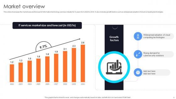 This slide showcases the market size and forecast of information technology services industry for 9 years from 2022 to 2030. It also includes growth factors such as widespread adoption of cloud computing technologies. If you are looking for a format to display your unique thoughts, then the professionally designed Market Overview Information Technology Startup Go To Market Strategy GTM SS V is the one for you. You can use it as a Google Slides template or a PowerPoint template. Incorporate impressive visuals, symbols, images, and other charts. Modify or reorganize the text boxes as you desire. Experiment with shade schemes and font pairings. Alter, share or cooperate with other people on your work. Download Market Overview Information Technology Startup Go To Market Strategy GTM SS V and find out how to give a successful presentation. Present a perfect display to your team and make your presentation unforgettable. This slide showcases the market size and forecast of information technology services industry for 9 years from 2022 to 2030. It also includes growth factors such as widespread adoption of cloud computing technologies.