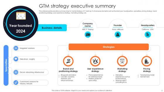 This slide presents executive summary of go to market strategy of IT start-up. It showcases elements such as founded year, headquarters, specialties, pricing strategy, brand positioning strategy, user experience strategy, marketing strategy, etc.Whether you have daily or monthly meetings, a brilliant presentation is necessary. GTM Strategy Executive Summary Information Technology Startup Go To Market Strategy GTM SS V can be your best option for delivering a presentation. Represent everything in detail using GTM Strategy Executive Summary Information Technology Startup Go To Market Strategy GTM SS V and make yourself stand out in meetings. The template is versatile and follows a structure that will cater to your requirements. All the templates prepared by Slidegeeks are easy to download and edit. Our research experts have taken care of the corporate themes as well. So, give it a try and see the results. This slide presents executive summary of go to market strategy of IT start-up. It showcases elements such as founded year, headquarters, specialties, pricing strategy, brand positioning strategy, user experience strategy, marketing strategy, etc.