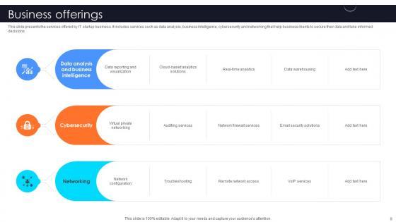 This slide presents the services offered by IT startup business. It includes services such as data analysis, business intelligence, cybersecurity and networking that help business clients to secure their data and take informed decisions.Slidegeeks is one of the best resources for PowerPoint templates. You can download easily and regulate Business Offerings Information Technology Startup Go To Market Strategy GTM SS V for your personal presentations from our wonderful collection. A few clicks is all it takes to discover and get the most relevant and appropriate templates. Use our Templates to add a unique zing and appeal to your presentation and meetings. All the slides are easy to edit and you can use them even for advertisement purposes. This slide presents the services offered by IT startup business. It includes services such as data analysis, business intelligence, cybersecurity and networking that help business clients to secure their data and take informed decisions.