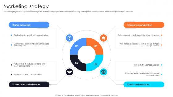 This slide highlights various promotional strategies for IT startup company which includes digital marketing, content personalization, events and webinars and partnerships and alliances.Crafting an eye-catching presentation has never been more straightforward. Let your presentation shine with this tasteful yet straightforward Marketing Strategy Information Technology Startup Go To Market Strategy GTM SS V template. It offers a minimalistic and classy look that is great for making a statement. The colors have been employed intelligently to add a bit of playfulness while still remaining professional. Construct the ideal Marketing Strategy Information Technology Startup Go To Market Strategy GTM SS V that effortlessly grabs the attention of your audience Begin now and be certain to wow your customers This slide highlights various promotional strategies for IT startup company which includes digital marketing, content personalization, events and webinars and partnerships and alliances.