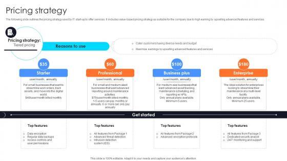 The following slide outlines the pricing strategy used by IT start-up to offer services. It includes value-based pricing strategy as suitable for the company due to high earning by upselling advanced features and services. Formulating a presentation can take up a lot of effort and time, so the content and message should always be the primary focus. The visuals of the PowerPoint can enhance the presenters message, so our Pricing Strategy Information Technology Startup Go To Market Strategy GTM SS V was created to help save time. Instead of worrying about the design, the presenter can concentrate on the message while our designers work on creating the ideal templates for whatever situation is needed. Slidegeeks has experts for everything from amazing designs to valuable content, we have put everything into Pricing Strategy Information Technology Startup Go To Market Strategy GTM SS V. The following slide outlines the pricing strategy used by IT start-up to offer services. It includes value-based pricing strategy as suitable for the company due to high earning by upselling advanced features and services.