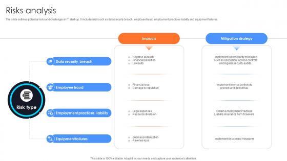 The slide outlines potential risks and challenges in IT start-up. It includes risk such as data security breach, employee fraud, employment practices liability and equipment failures.This modern and well-arranged Risks Analysis Information Technology Startup Go To Market Strategy GTM SS V provides lots of creative possibilities. It is very simple to customize and edit with the Powerpoint Software. Just drag and drop your pictures into the shapes. All facets of this template can be edited with Powerpoint, no extra software is necessary. Add your own material, put your images in the places assigned for them, adjust the colors, and then you can show your slides to the world, with an animated slide included. The slide outlines potential risks and challenges in IT start-up. It includes risk such as data security breach, employee fraud, employment practices liability and equipment failures.