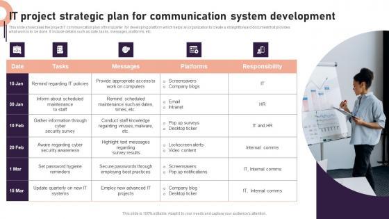 This slide showcases the project IT communication plan of first quarter for developing platform which helps an organization to create a straightforward document that provides what work is to be done. It include details such as date, tasks, messages, platforms, etc. Pitch your topic with ease and precision using this IT Project Strategic Plan For Communication System Development Structure Pdf. This layout presents information on Cyber Security Survey, IT Systems, Communication System Development. It is also available for immediate download and adjustment. So, changes can be made in the color, design, graphics or any other component to create a unique layout. This slide showcases the project IT communication plan of first quarter for developing platform which helps an organization to create a straightforward document that provides what work is to be done. It include details such as date, tasks, messages, platforms, etc.