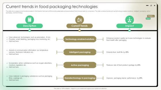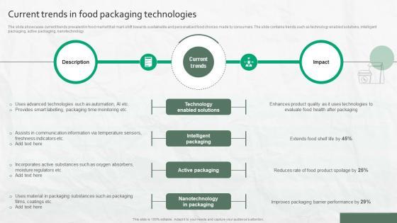The slide showcases current trends prevalent in food market that mark shift towards sustainable and personalized food choices made by consumers. The slide contains trends such as technology enabled solutions, intelligent packaging, active packaging, nanotechnology.Do you have to make sure that everyone on your team knows about any specific topic I yes, then you should give Current Trends In Food Packaging Technologies a try. Our experts have put a lot of knowledge and effort into creating this impeccable Current Trends In Food Packaging Technologies. You can use this template for your upcoming presentations, as the slides are perfect to represent even the tiniest detail. You can download these templates from the Slidegeeks website and these are easy to edit. So grab these today The slide showcases current trends prevalent in food market that mark shift towards sustainable and personalized food choices made by consumers. The slide contains trends such as technology enabled solutions, intelligent packaging, active packaging, nanotechnology.