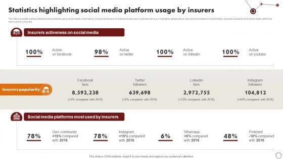The following slide outlines statistics that presents using social media channels by insurance industry to embrace brand and customer service. It highlights details about insurers activeness on social media, insurers popularity and social media platforms most used by insurers. Crafting an eye-catching presentation has never been more straightforward. Let your presentation shine with this tasteful yet straightforward Technology Trends In Online Insurance Statistics Highlighting Social Media Platform Usage By Insurers template. It offers a minimalistic and classy look that is great for making a statement. The colors have been employed intelligently to add a bit of playfulness while still remaining professional. Construct the ideal Technology Trends In Online Insurance Statistics Highlighting Social Media Platform Usage By Insurers that effortlessly grabs the attention of your audience Begin now and be certain to wow your customers The following slide outlines statistics that presents using social media channels by insurance industry to embrace brand and customer service. It highlights details about insurers activeness on social media, insurers popularity and social media platforms most used by insurers.