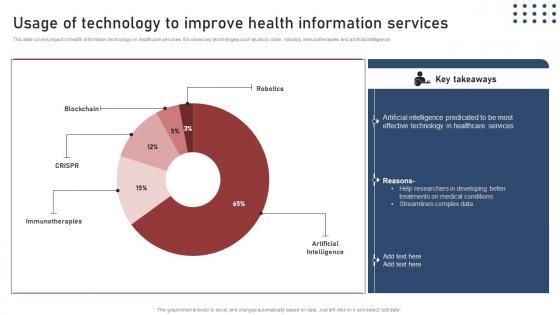 This slide covers impact of health information technology on healthcare services. It involves key technologies such as block chain, robotics, immunotherapies and artificial intelligence. If your project calls for a presentation, then Slidegeeks is your go to partner because we have professionally designed, easy to edit templates that are perfect for any presentation. After downloading, you can easily edit Incorporating HIS To Enhance Healthcare Services Usage Of Technology To Improve Health Information Services Sample PDF and make the changes accordingly. You can rearrange slides or fill them with different images. Check out all the handy templates