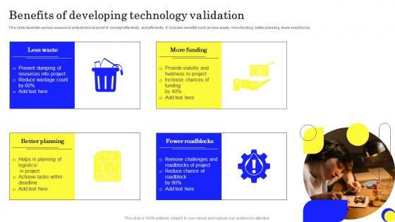 This slide illustrate various reasons to write technical proof of concept effectively and efficiently. It includes benefits such as less waste, more funding, better planning, fewer roadblocks. Showcasing this set of slides titled Benefits Of Developing Technology Validation Ppt Gallery Pdf. The topics addressed in these templates are Less Waste, More Funding, Better Planning, Fewer Roadblocks. All the content presented in this PPT design is completely editable. Download it and make adjustments in color, background, font etc. as per your unique business setting. This slide illustrate various reasons to write technical proof of concept effectively and efficiently. It includes benefits such as less waste, more funding, better planning, fewer roadblocks.