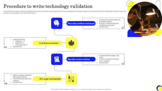 This slide showcase procedure to write technical proof of concept to grand approval form top management. It includes steps such as describe problem statement, list down resources, specify success criteria, set scope and timeline. Pitch your topic with ease and precision using this Procedure To Write Technology Validation Ppt Inspiration Format Pdf. This layout presents information on Describe Problem Statement, List Down Resources, Specify Success Criteria. It is also available for immediate download and adjustment. So, changes can be made in the color, design, graphics or any other component to create a unique layout. This slide showcase procedure to write technical proof of concept to grand approval form top management. It includes steps such as describe problem statement, list down resources, specify success criteria, set scope and timeline.