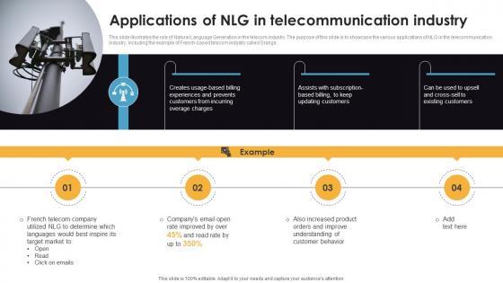This slide illustrates the role of Natural Language Generation in the telecom industry. The purpose of this slide is to showcase the various applications of NLG in the telecommunication industry, including the example of French-based telecom industry called Orange. Slidegeeks is one of the best resources for PowerPoint templates. You can download easily and regulate Applications Of NLG In Telecommunication Industry Natural Language Automation for your personal presentations from our wonderful collection. A few clicks is all it takes to discover and get the most relevant and appropriate templates. Use our Templates to add a unique zing and appeal to your presentation and meetings. All the slides are easy to edit and you can use them even for advertisement purposes. This slide illustrates the role of Natural Language Generation in the telecom industry. The purpose of this slide is to showcase the various applications of NLG in the telecommunication industry, including the example of French-based telecom industry called Orange.