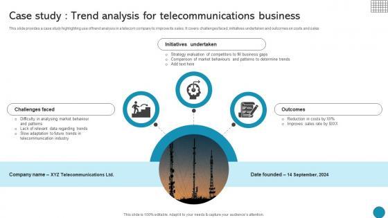 This slide provides a case study highlighting use of trend analysis in a telecom company to improve its sales. It covers challenges faced, initiatives undertaken and outcomes on costs and sales Slidegeeks is here to make your presentations a breeze with Case Study Trend Analysis For Telecommunications Business Driving Business Success Integrating Product With our easy-to-use and customizable templates, you can focus on delivering your ideas rather than worrying about formatting. With a variety of designs to choose from, you are sure to find one that suits your needs. And with animations and unique photos, illustrations, and fonts, you can make your presentation pop. So whether you are giving a sales pitch or presenting to the board, make sure to check out Slidegeeks first This slide provides a case study highlighting use of trend analysis in a telecom company to improve its sales. It covers challenges faced, initiatives undertaken and outcomes on costs and sales