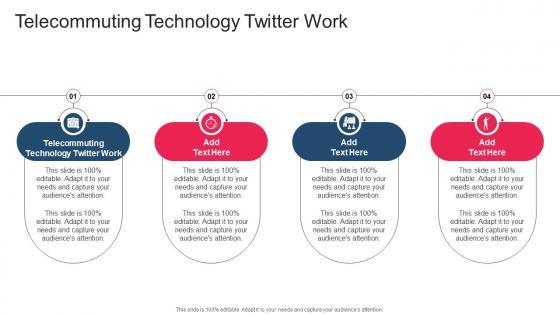 Introducing our well designed Telecommuting Technology Twitter Work In Powerpoint And Google Slides Cpb. This PowerPoint design presents information on topics like Telecommuting Technology Twitter Work. As it is predesigned it helps boost your confidence level. It also makes you a better presenter because of its high quality content and graphics. This PPT layout can be downloaded and used in different formats like PDF, PNG, and JPG. Not only this, it is available in both Standard Screen and Widescreen aspect ratios for your convenience. Therefore, click on the download button now to persuade and impress your audience. Our Telecommuting Technology Twitter Work In Powerpoint And Google Slides Cpb are topically designed to provide an attractive backdrop to any subject. Use them to look like a presentation pro.