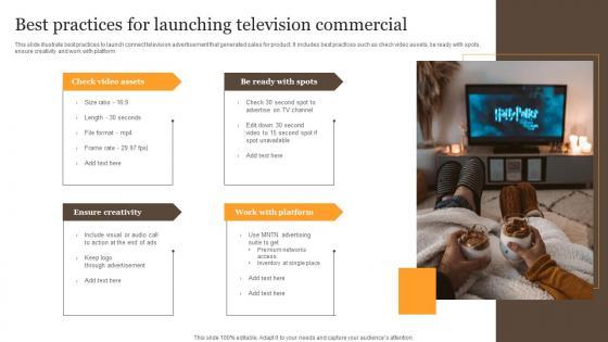 This slide illustrate best practices to launch connect television advertisement that generated sales for product. It includes best practices such as check video assets, be ready with spots, ensure creativity and work with platform Showcasing this set of slides titled Best Practices For Launching Television Commercial Rules Pdf. The topics addressed in these templates are Assets, Creativity, Platform. All the content presented in this PPT design is completely editable. Download it and make adjustments in color, background, font etc. as per your unique business setting. This slide illustrate best practices to launch connect television advertisement that generated sales for product. It includes best practices such as check video assets, be ready with spots, ensure creativity and work with platform
