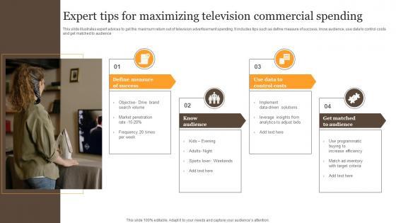 This slide illustrates expert advices to get the maximum return out of television advertisement spending. It includes tips such as define measure of success, know audience, use data to control costs and get matched to audience Showcasing this set of slides titled Expert Tips For Maximizing Television Commercial Spending Infographics Pdf. The topics addressed in these templates are Success Know, Audience, Control Costs. All the content presented in this PPT design is completely editable. Download it and make adjustments in color, background, font etc. as per your unique business setting. This slide illustrates expert advices to get the maximum return out of television advertisement spending. It includes tips such as define measure of success, know audience, use data to control costs and get matched to audience
