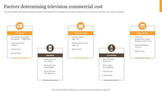 This slide illustrates various factors that determine television advertisement broadcasting cost. It includes elements such as TV show, time of year, time of day, airtime and location Pitch your topic with ease and precision using this Factors Determining Television Commercial Cost Diagrams Pdf. This layout presents information on Airtime, Year, Location. It is also available for immediate download and adjustment. So, changes can be made in the color, design, graphics or any other component to create a unique layout. This slide illustrates various factors that determine television advertisement broadcasting cost. It includes elements such as TV show, time of year, time of day, airtime and location
