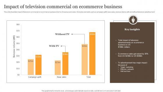 This slide illustrate impact of television commercial on ecommerce business in terms of revenue and sales. It includes elements such as campaign uplift, base sales, revenue returns with and without television advertisement Pitch your topic with ease and precision using this Impact Of Television Commercial On Ecommerce Business Diagrams Pdf. This layout presents information on Insights, Ecommerce, Business. It is also available for immediate download and adjustment. So, changes can be made in the color, design, graphics or any other component to create a unique layout. This slide illustrate impact of television commercial on ecommerce business in terms of revenue and sales. It includes elements such as campaign uplift, base sales, revenue returns with and without television advertisement