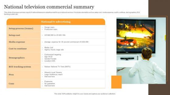 This slide showcase summary report of national television advertisement for promotional services. It includes elements such as setup cost, media expense, cost to continue, demographics, ROI tracking system etc. Showcasing this set of slides titled National Television Commercial Summary Rules Pdf. The topics addressed in these templates are Summary, National, Television. All the content presented in this PPT design is completely editable. Download it and make adjustments in color, background, font etc. as per your unique business setting. This slide showcase summary report of national television advertisement for promotional services. It includes elements such as setup cost, media expense, cost to continue, demographics, ROI tracking system etc.
