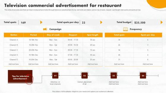 This slide showcases plan that can help in restaurant promotion through television advertisement. Its key elements are station, period, day of week, daypart, spot length, total spots and spots per day. Slidegeeks is one of the best resources for PowerPoint templates. You can download easily and regulate Online Promotional Activities Television Commercial Advertisement Information Pdf for your personal presentations from our wonderful collection. A few clicks is all it takes to discover and get the most relevant and appropriate templates. Use our Templates to add a unique zing and appeal to your presentation and meetings. All the slides are easy to edit and you can use them even for advertisement purposes. This slide showcases plan that can help in restaurant promotion through television advertisement. Its key elements are station, period, day of week, daypart, spot length, total spots and spots per day.