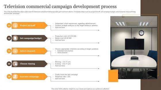 This slide illustrates five steps action plan for television advertisement proposal to get maximum returns. It includes steps such as project kickoff, set campaign budget, select channel, choose timing and execute campaign Pitch your topic with ease and precision using this Television Commercial Campaign Development Process Infographics Pdf. This layout presents information on Project Kickoff, Campaign Budget, Select Channel. It is also available for immediate download and adjustment. So, changes can be made in the color, design, graphics or any other component to create a unique layout. This slide illustrates five steps action plan for television advertisement proposal to get maximum returns. It includes steps such as project kickoff, set campaign budget, select channel, choose timing and execute campaign