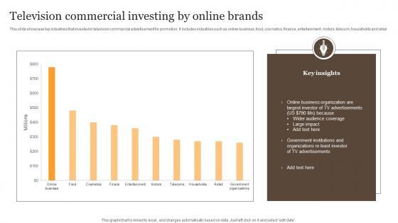 This slide showcase top industries that invested in television commercial advertisement for promotion. It includes industries such as online business, food, cosmetics, finance, entertainment, motors, telecom, households and retail Showcasing this set of slides titled Television Commercial Investing By Online Brands Pictures Pdf. The topics addressed in these templates are Key Insights, Brands, Television. All the content presented in this PPT design is completely editable. Download it and make adjustments in color, background, font etc. as per your unique business setting. This slide showcase top industries that invested in television commercial advertisement for promotion. It includes industries such as online business, food, cosmetics, finance, entertainment, motors, telecom, households and retail