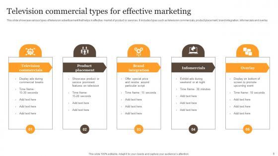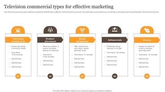 This slide showcase various types of television advertisement that helps in effective market of product or services. It includes types such as television commercials, product placement, brand integration, infomercials and overlay Showcasing this set of slides titled Television Commercial Types For Effective Marketing Brochure Pdf. The topics addressed in these templates are Television Commercials, Product Placement, Brand Integration. All the content presented in this PPT design is completely editable. Download it and make adjustments in color, background, font etc. as per your unique business setting. This slide showcase various types of television advertisement that helps in effective market of product or services. It includes types such as television commercials, product placement, brand integration, infomercials and overlay