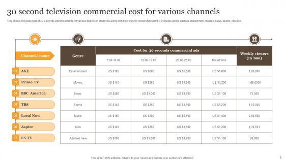 This slide showcase cost of 30 seconds advertisements for various television channels along with their weekly viewership count. It includes genre such as entrainment, movies, news, sports, kids etc. Showcasing this set of slides titled 30 Second Television Commercial Cost For Various Channels Brochure Pdf. The topics addressed in these templates are Channels Name, Channels, Second. All the content presented in this PPT design is completely editable. Download it and make adjustments in color, background, font etc. as per your unique business setting. This slide showcase cost of 30 seconds advertisements for various television channels along with their weekly viewership count. It includes genre such as entrainment, movies, news, sports, kids etc.