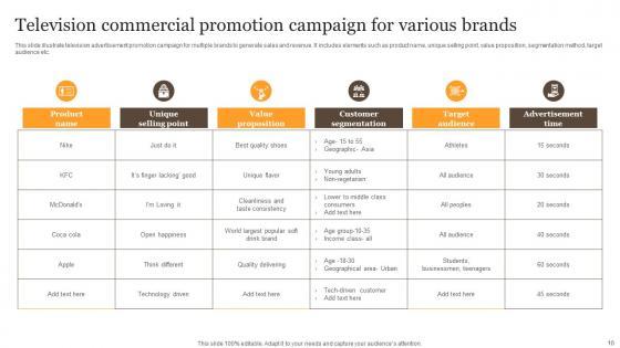 This slide illustrate television advertisement promotion campaign for multiple brands to generate sales and revenue. It includes elements such as product name, unique selling point, value proposition, segmentation method, target audience etc. Showcasing this set of slides titled Television Commercial Promotion Campaign For Various Brands Ideas Pdf. The topics addressed in these templates are Unique, Value, Customer. All the content presented in this PPT design is completely editable. Download it and make adjustments in color, background, font etc. as per your unique business setting. This slide illustrate television advertisement promotion campaign for multiple brands to generate sales and revenue. It includes elements such as product name, unique selling point, value proposition, segmentation method, target audience etc.