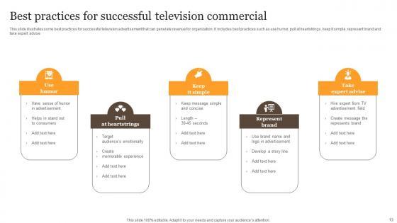 This slide illustrates some best practices for successful television advertisement that can generate revenue for organization. It includes best practices such as use humor, pull at heartstrings, keep it simple, represent brand and take expert advise Pitch your topic with ease and precision using this Best Practices For Successful Television Commercial Download Pdf. This layout presents information on Humor, Heartstrings, Represent Brand. It is also available for immediate download and adjustment. So, changes can be made in the color, design, graphics or any other component to create a unique layout. This slide illustrates some best practices for successful television advertisement that can generate revenue for organization. It includes best practices such as use humor, pull at heartstrings, keep it simple, represent brand and take expert advise