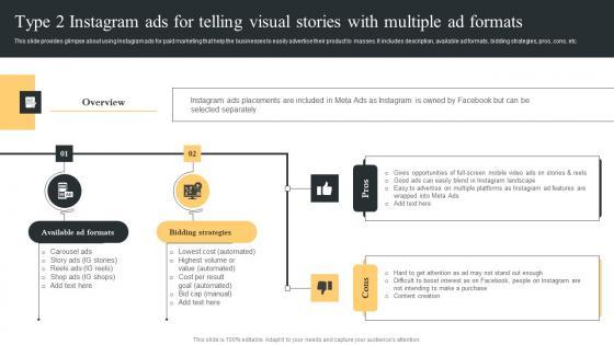 This slide provides glimpse about using Instagram ads for paid marketing that help the businesses to easily advertise their product to masses. It includes description, available ad formats, bidding strategies, pros, cons, etc. Slidegeeks is here to make your presentations a breeze with Type 2 Instagram Ads For Telling Visual Stories With Multiple Ad Formats Brochure PDF With our easy to use and customizable templates, you can focus on delivering your ideas rather than worrying about formatting. With a variety of designs to choose from, you are sure to find one that suits your needs. And with animations and unique photos, illustrations, and fonts, you can make your presentation pop. So whether you are giving a sales pitch or presenting to the board, make sure to check out Slidegeeks first.