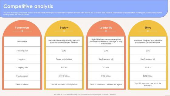 This slide includes a comparative analysis of life insurance providing the company with competitors available in the market. The analysis is done based on parameters such as description, founding year, location, company size, funding raised, and services offered. Want to ace your presentation in front of a live audience Our Competitive Analysis Term Life Insurance Platform Investor Funding Elevator Pitch Deck can help you do that by engaging all the users towards you. Slidegeeks experts have put their efforts and expertise into creating these impeccable powerpoint presentations so that you can communicate your ideas clearly. Moreover, all the templates are customizable, and easy-to-edit and downloadable. Use these for both personal and commercial use. This slide includes a comparative analysis of life insurance providing the company with competitors available in the market. The analysis is done based on parameters such as description, founding year, location, company size, funding raised, and services offered.