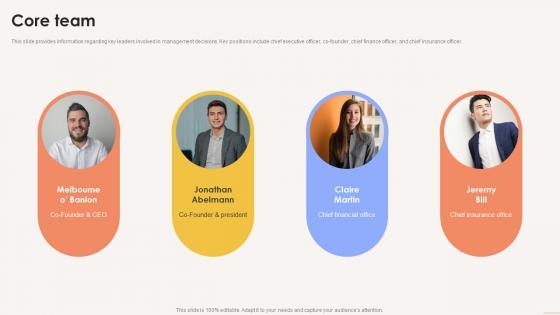 This slide provides information regarding key leaders involved in management decisions. Key positions include chief executive officer, co-founder, chief finance officer, and chief insurance officer. Do you have to make sure that everyone on your team knows about any specific topic I yes, then you should give Core Team Term Life Insurance Platform Investor Funding Elevator Pitch Deck a try. Our experts have put a lot of knowledge and effort into creating this impeccable Core Team Term Life Insurance Platform Investor Funding Elevator Pitch Deck. You can use this template for your upcoming presentations, as the slides are perfect to represent even the tiniest detail. You can download these templates from the Slidegeeks website and these are easy to edit. So grab these today This slide provides information regarding key leaders involved in management decisions. Key positions include chief executive officer, co-founder, chief finance officer, and chief insurance officer.