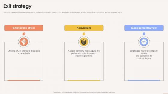 This slide presents different exit strategies for business to reduce the investors risk. It includes strategies such as initial public officer, acquisition, and management buyout. From laying roadmaps to briefing everything in detail, our templates are perfect for you. You can set the stage with your presentation slides. All you have to do is download these easy-to-edit and customizable templates. Exit Strategy Term Life Insurance Platform Investor Funding Elevator Pitch Deck will help you deliver an outstanding performance that everyone would remember and praise you for. Do download this presentation today. This slide presents different exit strategies for business to reduce the investors risk. It includes strategies such as initial public officer, acquisition, and management buyout.