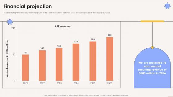 This slide highlights the financial performance projection of the term life insurance platform. It shows annual revenue growth in the span of four years. Slidegeeks is here to make your presentations a breeze with Financial Projection Term Life Insurance Platform Investor Funding Elevator Pitch Deck With our easy-to-use and customizable templates, you can focus on delivering your ideas rather than worrying about formatting. With a variety of designs to choose from, you are sure to find one that suits your needs. And with animations and unique photos, illustrations, and fonts, you can make your presentation pop. So whether you are giving a sales pitch or presenting to the board, make sure to check out Slidegeeks first This slide highlights the financial performance projection of the term life insurance platform. It shows annual revenue growth in the span of four years.