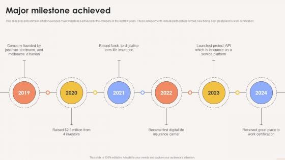 This slide presents a timeline that showcases major milestones achieved by the company in the last few years. These achievements include partnerships formed, new hiring, best great place to work certification. If you are looking for a format to display your unique thoughts, then the professionally designed Major Milestone Achieved Term Life Insurance Platform Investor Funding Elevator Pitch Deck is the one for you. You can use it as a Google Slides template or a PowerPoint template. Incorporate impressive visuals, symbols, images, and other charts. Modify or reorganize the text boxes as you desire. Experiment with shade schemes and font pairings. Alter, share or cooperate with other people on your work. Download Major Milestone Achieved Term Life Insurance Platform Investor Funding Elevator Pitch Deck and find out how to give a successful presentation. Present a perfect display to your team and make your presentation unforgettable. This slide presents a timeline that showcases major milestones achieved by the company in the last few years. These achievements include partnerships formed, new hiring, best great place to work certification.