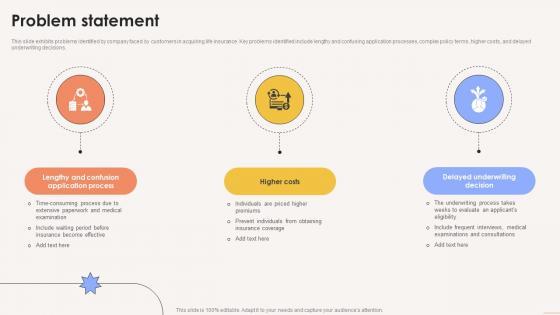 This slide exhibits problems identified by company faced by customers in acquiring life insurance. Key problems identified include lengthy and confusing application processes, complex policy terms, higher costs, and delayed underwriting decisions. Formulating a presentation can take up a lot of effort and time, so the content and message should always be the primary focus. The visuals of the PowerPoint can enhance the presenters message, so our Problem Statement Term Life Insurance Platform Investor Funding Elevator Pitch Deck was created to help save time. Instead of worrying about the design, the presenter can concentrate on the message while our designers work on creating the ideal templates for whatever situation is needed. Slidegeeks has experts for everything from amazing designs to valuable content, we have put everything into Problem Statement Term Life Insurance Platform Investor Funding Elevator Pitch Deck. This slide exhibits problems identified by company faced by customers in acquiring life insurance. Key problems identified include lengthy and confusing application processes, complex policy terms, higher costs, and delayed underwriting decisions.
