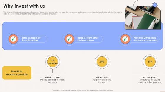 This slide exhibits strengths and compelling reasons for investors to invest in the company. It showcases compelling reasons such as rated excellent by policyholder, rated by better business bureau, and partnership with leading reinsurance companies. The best PPT templates are a great way to save time, energy, and resources. Slidegeeks have 100 percent editable powerpoint slides making them incredibly versatile. With these quality presentation templates, you can create a captivating and memorable presentation by combining visually appealing slides and effectively communicating your message. Download Why Invest With Us Term Life Insurance Platform Investor Funding Elevator Pitch Deck from Slidegeeks and deliver a wonderful presentation. This slide exhibits strengths and compelling reasons for investors to invest in the company. It showcases compelling reasons such as rated excellent by policyholder, rated by better business bureau, and partnership with leading reinsurance companies.