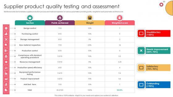 Mentioned slide demonstrates supplier production process and material inspection on various parameters providing points, weights for each parameter and final score. This Strategic Supplier Evaluation Supplier Product Quality Testing And Assessment from Slidegeeks makes it easy to present information on your topic with precision. It provides customization options, so you can make changes to the colors, design, graphics, or any other component to create a unique layout. It is also available for immediate download, so you can begin using it right away. Slidegeeks has done good research to ensure that you have everything you need to make your presentation stand out. Make a name out there for a brilliant performance. Mentioned slide demonstrates supplier production process and material inspection on various parameters providing points, weights for each parameter and final score.