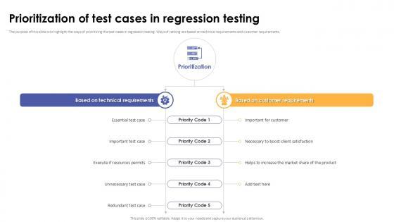 The purpose of this slide is to highlight the ways of prioritizing the test cases in regression testing. Ways of ranking are based on technical requirements and customer requirements. From laying roadmaps to briefing everything in detail, our templates are perfect for you. You can set the stage with your presentation slides. All you have to do is download these easy-to-edit and customizable templates. Prioritization Of Test Cases In Regression Testing Corrective Regression Testing Ppt Example will help you deliver an outstanding performance that everyone would remember and praise you for. Do download this presentation today. The purpose of this slide is to highlight the ways of prioritizing the test cases in regression testing. Ways of ranking are based on technical requirements and customer requirements.
