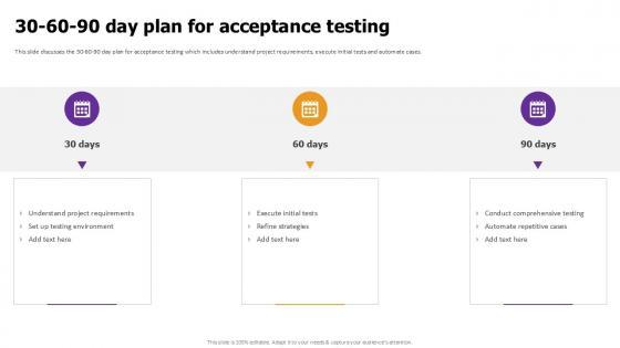 This slide discusses the 30-60-90 day plan for acceptance testing which includes understand project requirements, execute initial tests and automate cases. Find a pre-designed and impeccable 30 60 90 Day Plan For Effective Test Data Management Ppt Example The templates can ace your presentation without additional effort. You can download these easy-to-edit presentation templates to make your presentation stand out from others. So, what are you waiting for Download the template from Slidegeeks today and give a unique touch to your presentation. This slide discusses the 30-60-90 day plan for acceptance testing which includes understand project requirements, execute initial tests and automate cases.