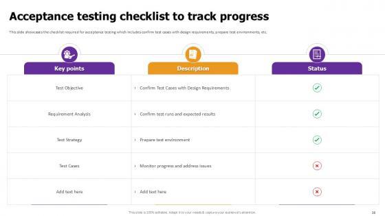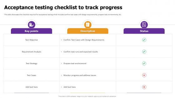 This slide showcases the checklist required for acceptance testing which includes confirm test cases with design requirements, prepare test environments, etc. Create an editable Acceptance Testing Checklist Effective Test Data Management Ppt Powerpoint that communicates your idea and engages your audience. Whether you are presenting a business or an educational presentation, pre-designed presentation templates help save time. Acceptance Testing Checklist Effective Test Data Management Ppt Powerpoint is highly customizable and very easy to edit, covering many different styles from creative to business presentations. Slidegeeks has creative team members who have crafted amazing templates. So, go and get them without any delay. This slide showcases the checklist required for acceptance testing which includes confirm test cases with design requirements, prepare test environments, etc.